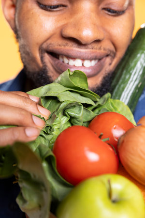 African american man looks at ethically sourced ripe goods in a paper bag, smelling the fresh scent of fruits and veggies in studio. Chef cooking with bio organic ingredients. Close up.