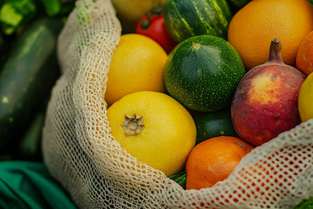 A bright display of fresh vegetables and fruits in eco-friendly bags