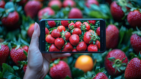 A close-up of a hand holding a phone, taking a photo of vibrant, fresh strawberries, blending technology with nature.