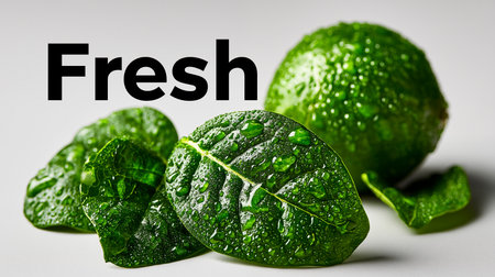 Word fresh formed from vibrant green leaves covered in dew drops