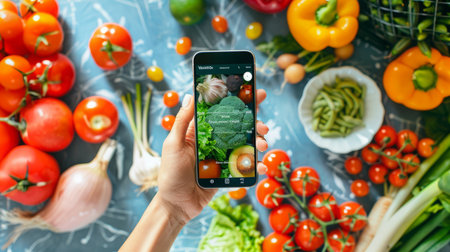 Smartphone screen showcases colorful farm-to-table app with fresh fruits and vegetables. Minimalist design with clean white surface, concept of nutrition, healthy living, and local agriculture.