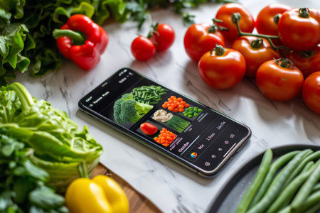 A smartphone lies on a kitchen counter displaying a colorful meal planning application, surrounded by fresh ingredients for a healthy recipe