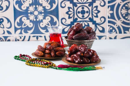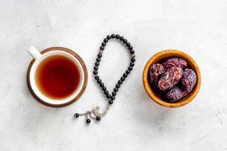 Ramadan Kareem background. Islamic rosary and dates fruits with tea