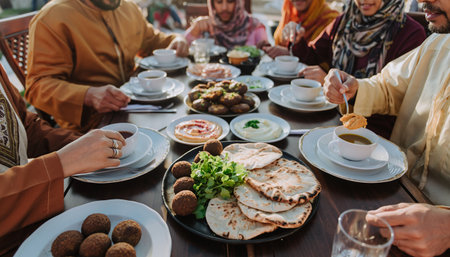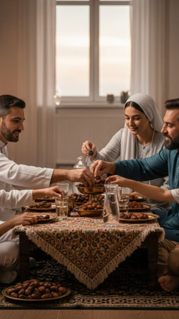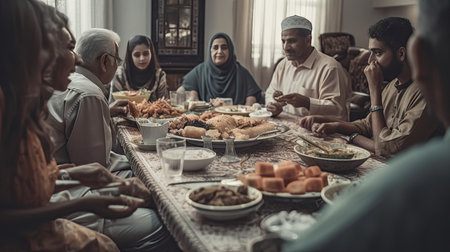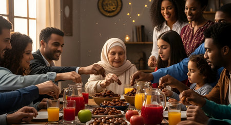 A traditional and diverse Muslim family comes together to share a delicious iftar meal during the sacred month of Ramadan, embodying the essence of familial joy, cultural richness, and spiritual unity in their shared celebration