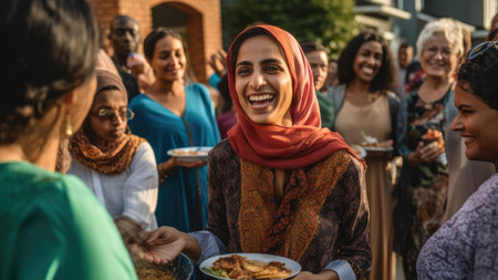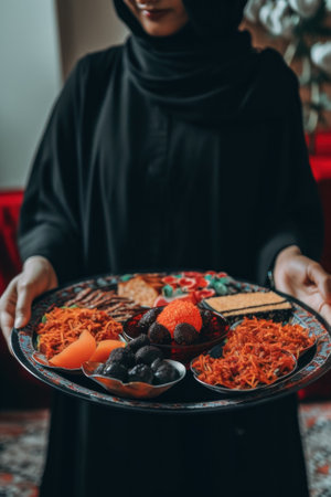 A woman in a hijab holding a plate of food. Generative AI image.