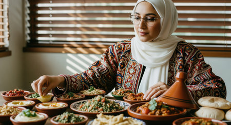 Muslim woman in a white hijab and glasses, wearing an embroidered jacket, reaching for food from a large spread of traditional middle eastern dishes on a table.