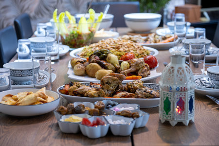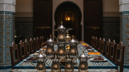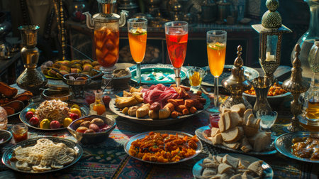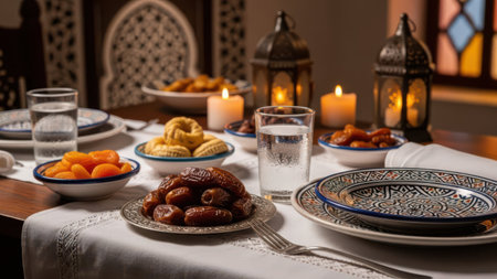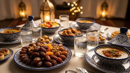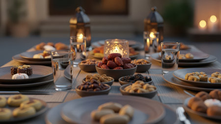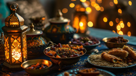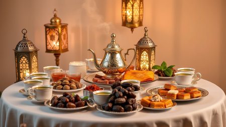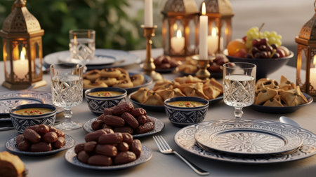A beautifully set table with ornate lanterns, intricate plates, and an array of traditional dishes. The table is adorned with dates, pastries, and various delicacies, creating a warm and inviting atmosphere.