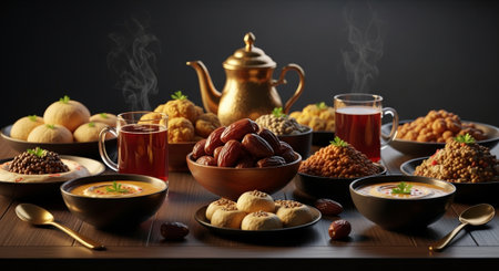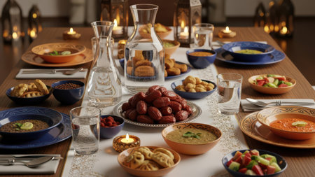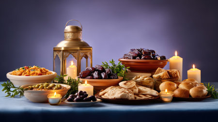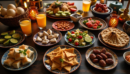This vibrant image captures an exquisite arrangement of traditional dishes, date fruits, and candles, creating a warm atmosphere for festive gatherings.