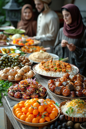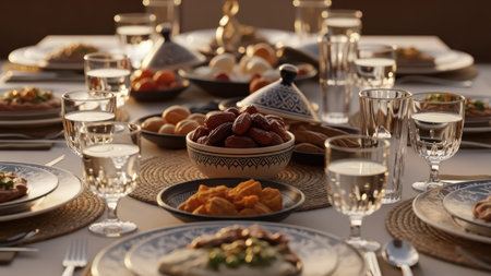 Families gather for iftar celebration during Ramadan with traditional dishes and shared moments of joy and connection