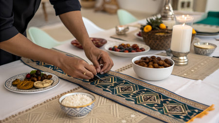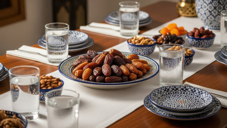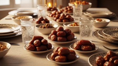 Gathering around a table to share dates during iftar in a home filled with Ramadan spirit and family bonds