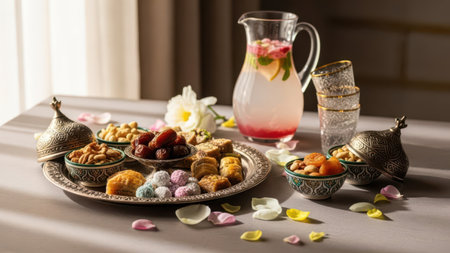 A beautifully arranged table features an assortment of sweets and drinks. The table is adorned with intricate metal trays filled with various types of sweets, including nuts, dried fruits, and pastries. A pitcher of pink lemonade and a glass are also present, along with a few scattered rose petals adding a touch of elegance. The scene is set against a backdrop of a window with sheer curtains, allowing soft natural light to illuminate the setting.