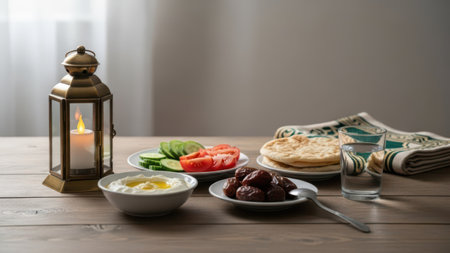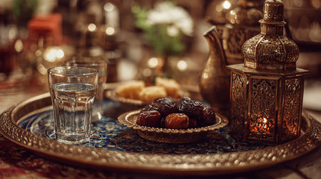 Lantern and dates on dinner table for taking and eating on iftar for family