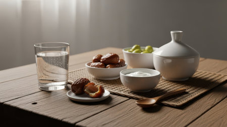 A rustic wooden table set with a traditional breakfast spread. The table features a bowl of dates, a bowl of yogurt, a glass of milk, a piece of flatbread, and a pitcher of liquid, possibly tea or coffee. The scene is set against a neutral background, highlighting the simplicity and warmth of the meal.