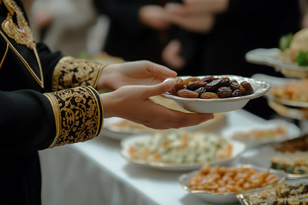 dried dates in the hands of a Muslim woman during a banquet