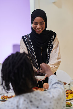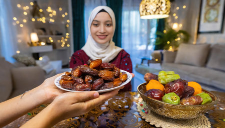 In a heartwarming scene during the sacred month of Ramadan, a traditional Muslim woman offers dates to her family gathered around the table, exemplifying the spirit of unity, generosity, and cultural richness during this festive and spiritual occasion