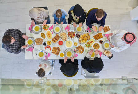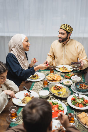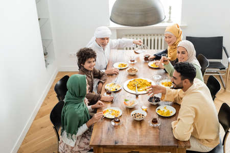 high angle view of happy multiethnic muslim family having dinner at home