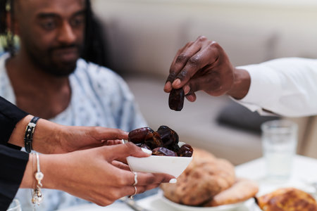 African American Muslim man delicately takes dates to break his fast during the Ramadan month, seated at the family dinner table, embodying a scene of spiritual reflection, cultural tradition, and the shared anticipation of the communal iftar