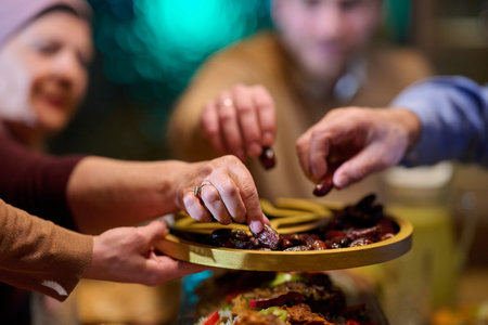Eid Mubarak Muslim family having Iftar dinner eating dates to break feast. Eating traditional food during Ramadan feasting month at home. The Islamic Halal Eating and Drinking at modern western Islam