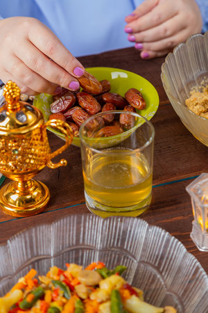 Time to break our fast. a muslim family breaking their fast with dates.