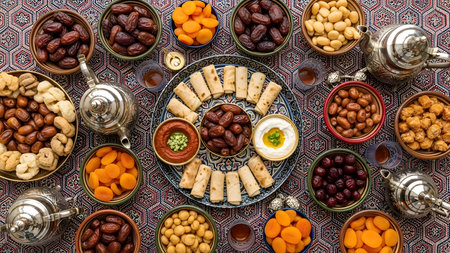 A vibrant traditional feast showcasing a variety of dried fruits, especially dates, alongside an array of rich dishes. Ideal for celebrations.