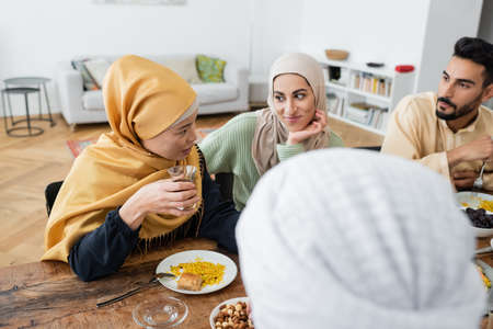Smiling muslim parents talking near kids and iftar dinner at home
