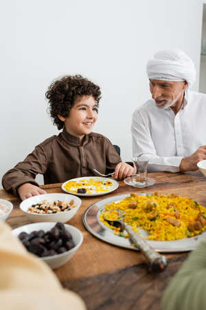 smiling arabian boy having family dinner near muslim grandfather