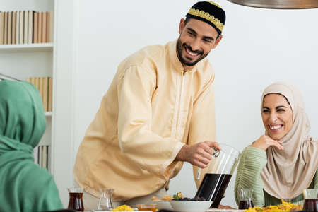 happy muslim man in skullcap pouring tea near happy woman in hijab