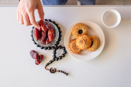 A female hand holds a tray with dates, and water and a rosary - hthe things used to break the fast at sunset during the Muslim holy month of Ramadan. Selective focus, place for text.