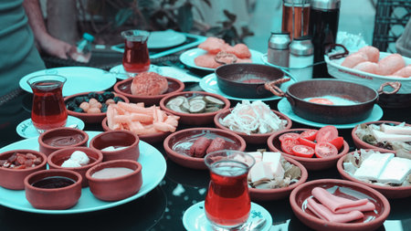 Table with food and drinks in moroccan restaurant, mediterranean cuisine