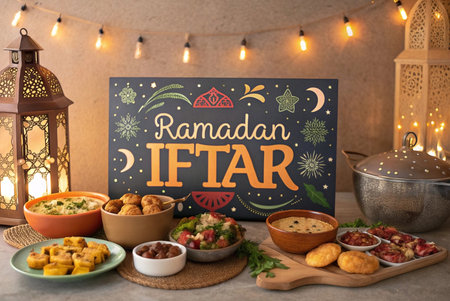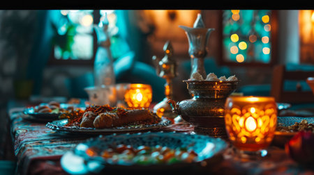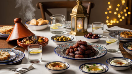Iftar Feast: A Beautifully Styled Table Set with Traditional Dishes like Harira Soup, Samosas, and Dates, Bathed in Warm Lighting, Creating an Inviting Atmosphere for Ramadan Celeb
