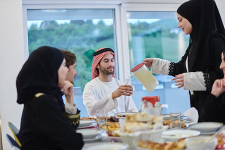 Happy Muslim family having iftar dinner during Ramadan dining table at home.