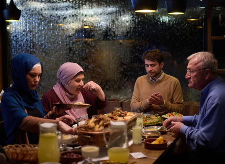Muslim family gathers at a restaurant to break fast during Ramadan with traditional food and decorations