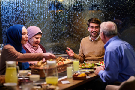 A modern and traditional European Islamic family comes together for iftar in a contemporary restaurant during the Ramadan fasting period, embodying cultural harmony and familial unity amidst a culinary celebration of diversity