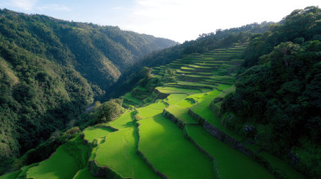 Steep terraces of rice plantations in Philippines. Agricultural landscape surrounded by lush tropical vegetation.