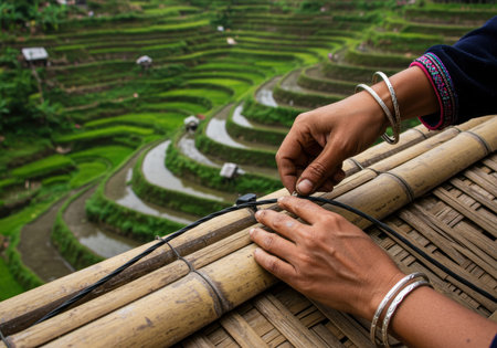 Hands crafting bamboo fence overlooking lush rice terraces in rural landscape.