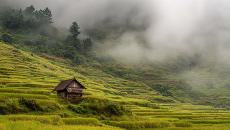 Experience the serene beauty of misty rice terraces, featuring a rustic hut and lush greenery, creating a tranquil atmosphere amidst majestic mountains.