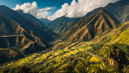 Sun rays piercing through the peaks onto the lush terraced rice paddies in a majestic mountainous landscape during early morning.