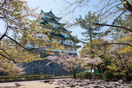 Cherry blossom or sakura trees with Nagoya castle background in spring season, Aichi prefecture, Japan. Magnificent scene at famous travel landmark.