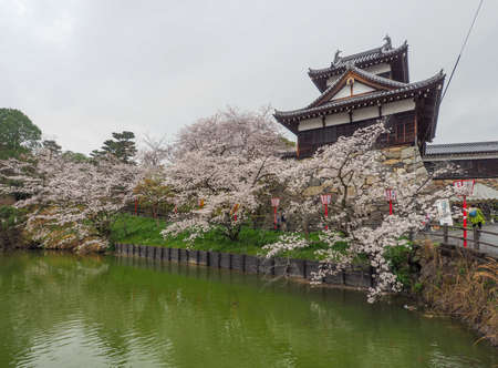 Inuyama, Japan - 2 April 2016: Inuyama castle historic building landmark in spring with beautiful cherry blossom. Tourist is enjoy viewing cherry blossoms.
