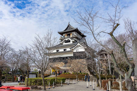 INUYAMA, JAPAN - JANUARY 18, 2020: Inuyama castle and the garden in front of the castle in Aichi, Japan. This is a famous place of cherry blossoms in Inuyama City and there are about 40 cherry trees here.