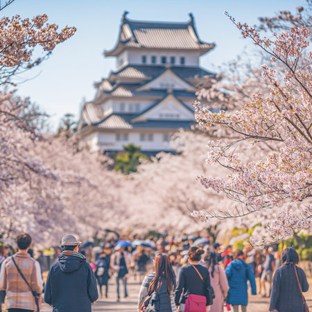 Spring, cherry blossoms, ancient Japanese castles, tourists, tours, spring leaves, generated from AI generate.