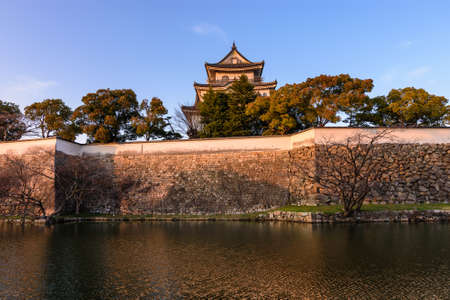 View to the Sunset Osaka Castle under Blue Sky and Trees, Japan