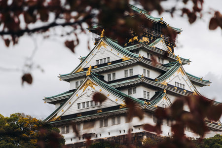 Ancient Osaka castle and maple trees in Autumn Kansai Japan