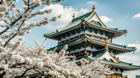 A traditional Japanese temple with ornate roofline, framed by blooming cherry blossoms under a blue sky with clouds.