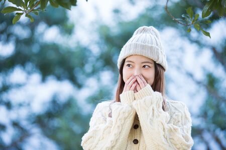 Beautiful Woman portrait in winter fashion clothing on the rural street in Japan