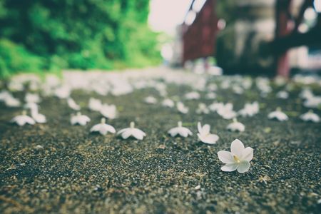 Closed-up White Wild Water Plum Flowers on Ground in Vintage Style. (Selective Focus)