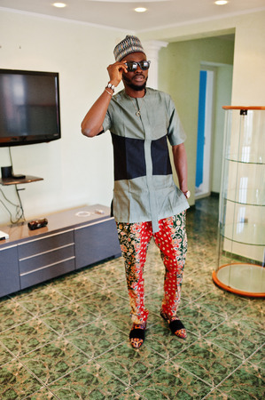 Mega stylish african man in traditional jacket pose. Fashionable black guy in hat and sunglasses.
