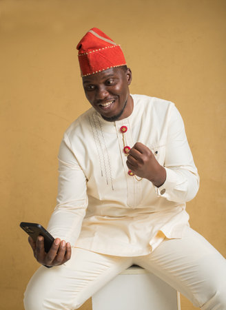 Yoruba Culturally Dressed Business Man Sitting with Phone in Hand in Happy News