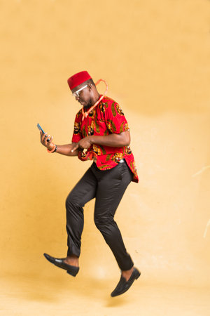 Igbo Traditionally Dressed Business Man in Mid Air with Phone in Hand