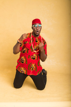 Igbo Traditionally Dressed Business Man Kneel and Happy